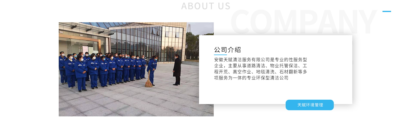 安徽天賦清潔服務有限公司是的服務型企業,主要從事道路清潔、物業托管保潔、工程開荒、高空作業、地毯清洗、石材翻新等多項服務為一體的環(huán)保型清潔公司。公司管理機制完善,清潔作業經驗豐富,擁有技術力量,嚴格實行崗前培訓—崗中督查—上崗在培訓的員工管理措施,憑著優(yōu)良的清潔質量和嚴格的督查管理,為眾多企事業單位、醫(yī)院、酒店、廠區商場、物業、道路、學校、公園等提供后勤清潔服務。在業內擁有良好的口碑。工作人員,服務態(tài)度優(yōu),竭力為客戶提供好的保潔服務。安徽天賦清潔服務有限公司:致力于長期合作關系,提高服務質量,提供高標準的清潔服務。公司的經營理念:為營造一個更清潔、亮麗的生活和工作環(huán)境而努力!“誠信”是公司成功保證。“客戶至上,信譽為首”是公司宗旨。高標準提供服務,維護客戶利益、形象,是我始終不渝的目標。